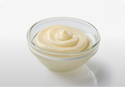A thick smooth layer of mayonnaise, always evenly spread.